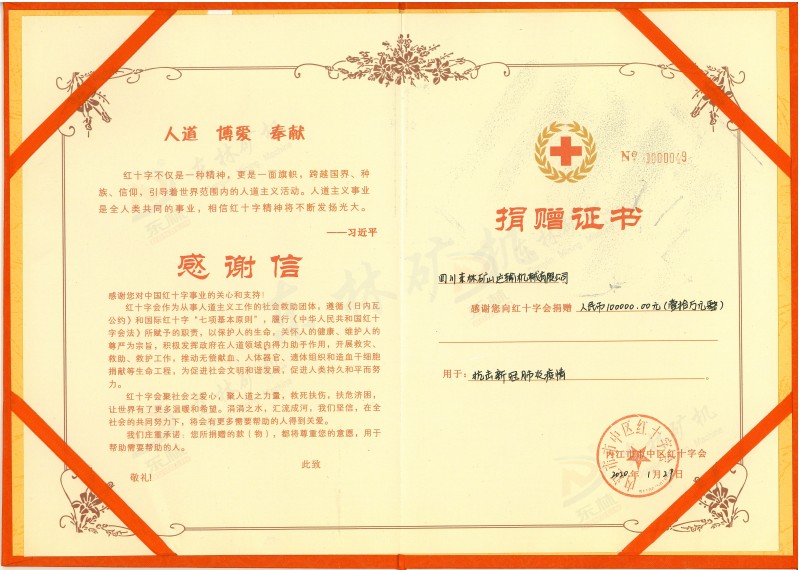On January 29th, Sichuan Donglin Mine Transportation Machinery Co., Ltd. donated 100,000 yuan through the Red Cross Society of Neijiang City Central District to support the prevention and control of the new crown virus epidemic in the city central district.